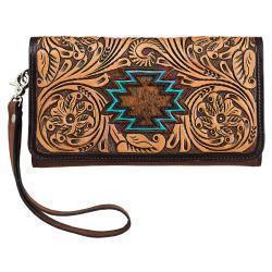 Portefeuille Angel Ranch par M&F Western Products de la collection Selena. Matériau synthétique marron avec un turquoise peint à la main et marron autour du filigrane aztèque. Bracelet amovible en PU. À l’intérieur, il y a un porte-chéquier, des emplacements pour cartes et billets ainsi qu’une fenêtre d’identification. À l’arrière, il y a une poche zippée et un petit patch aztèque avec le logo Angel Ranch travaillé à la main.