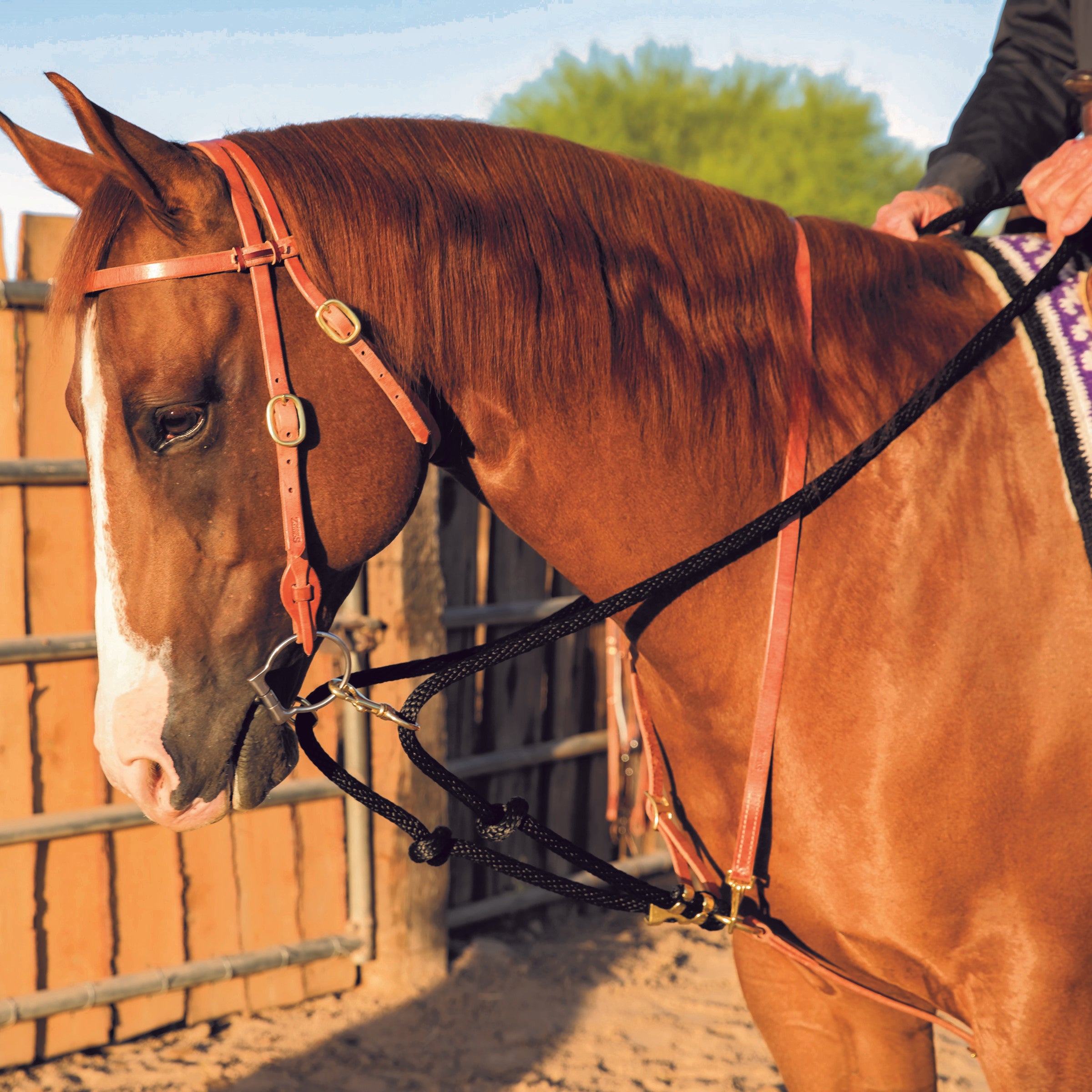 Martingale Reine Allemande Al Dunning de Schutz Brothers est une martingale qui vous permet de placer la tête du cheval en position, puis elle transfère la traction directement sur le mors avec l'utilisation de nœuds dans la corde. Cela limite l'effet dessandant après avoir atteint la position de tête souhaitée. Sangle du cou maintient corde dans position sécurisée, et est réglable.