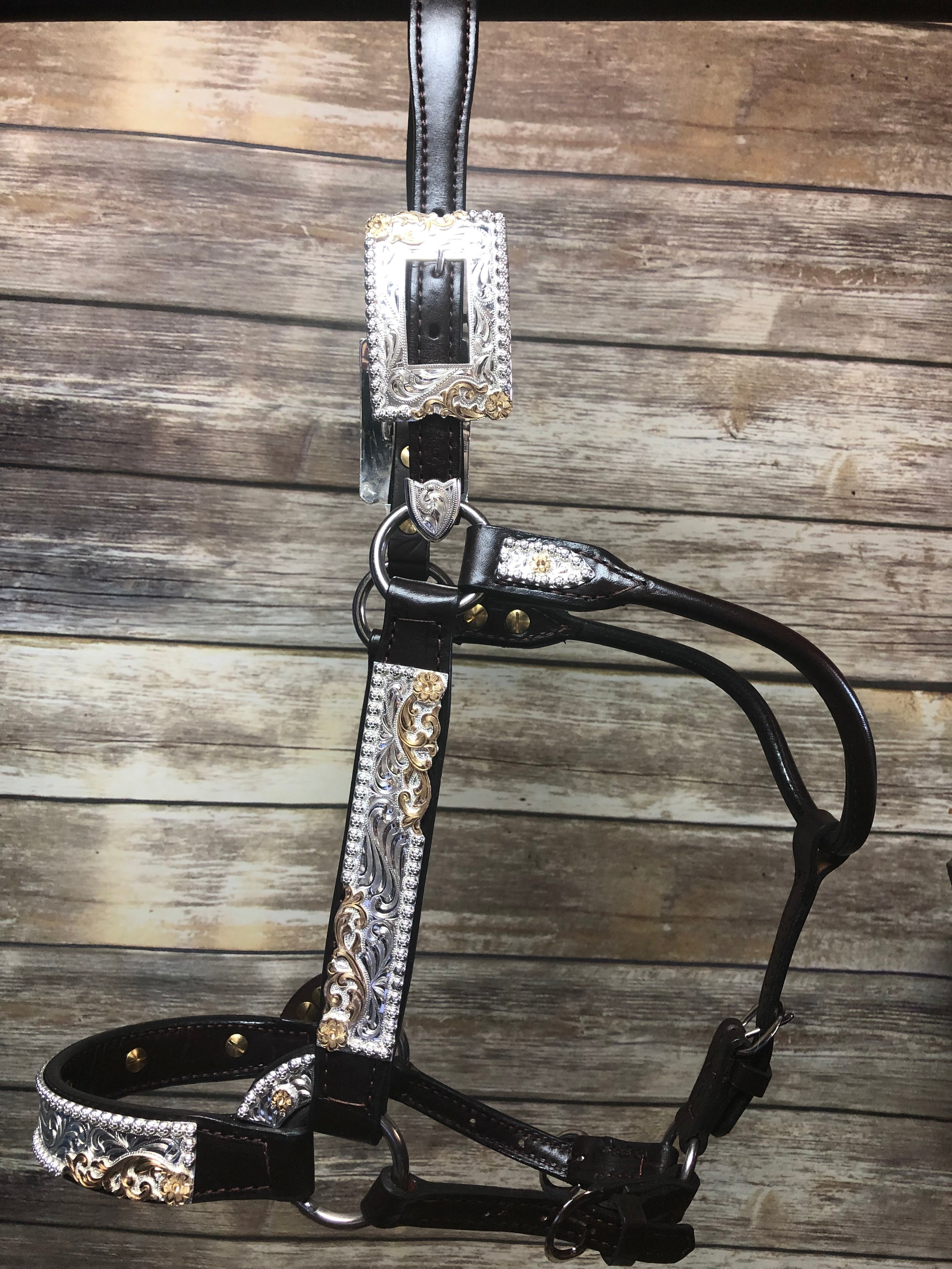 Le Licou de Compétition Santana par Kathy's Show arbore une bordure Berry tout en argent gravé avec des fleurs et des vignes en bronze de bijoutiers dans les coins du design carré.