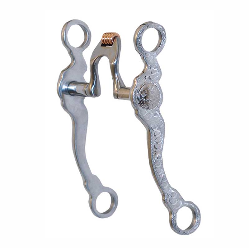 Mors FG à Port Haut avec Système à Ressort et Roulettes en Cuivre. Ce mors est dans la Collection François Gauthier et est en aluminium. Embouchure de 5-1/8" et un port en cuillère élevé avec un système de ressort et des rouleaux de cuivre sur la parti supérieur du port. Branche moyenne gravée de 8-1/4".