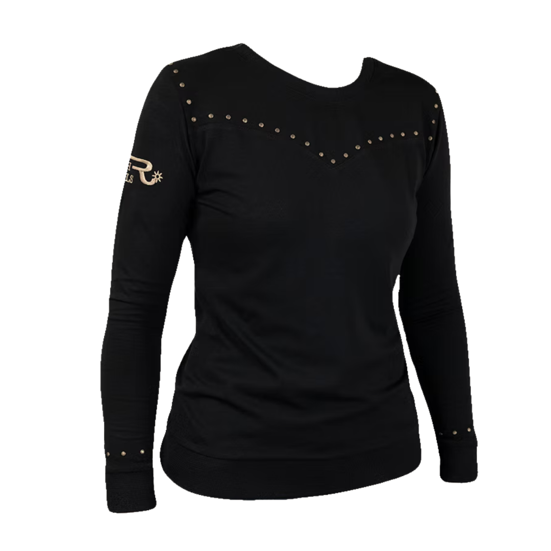 Le nouveau t-shirt manches longues Ranch Girls « MONICA » en noir allie charme western authentique et détails élégants. Ses coutures courbes et son empiècement orné de rivets lui confèrent un style distinctif. Confectionné en jersey de coton de haute qualité avec des poignets élégants, il offre une coupe confortable et agréable à porter. Sa matière en jersey ajustée met en valeur la silhouette – idéal pour les Ranch Girls assurées. Une fine broderie du logo de la marque sur l’épaule apporte une touche finale subtile. Ce t-shirt western est un véritable indispensable pour toutes les vraies Ranch Girls