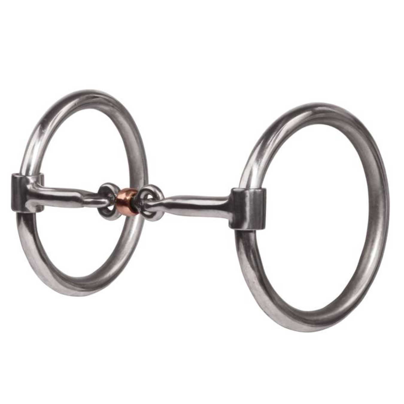Convient à tout cheval, fait de fer doux avec des incrustations de cuivre pour aider à garder la bouche du cheval doux et humide. Anneaux de 3" et bouche de 5 1/4".