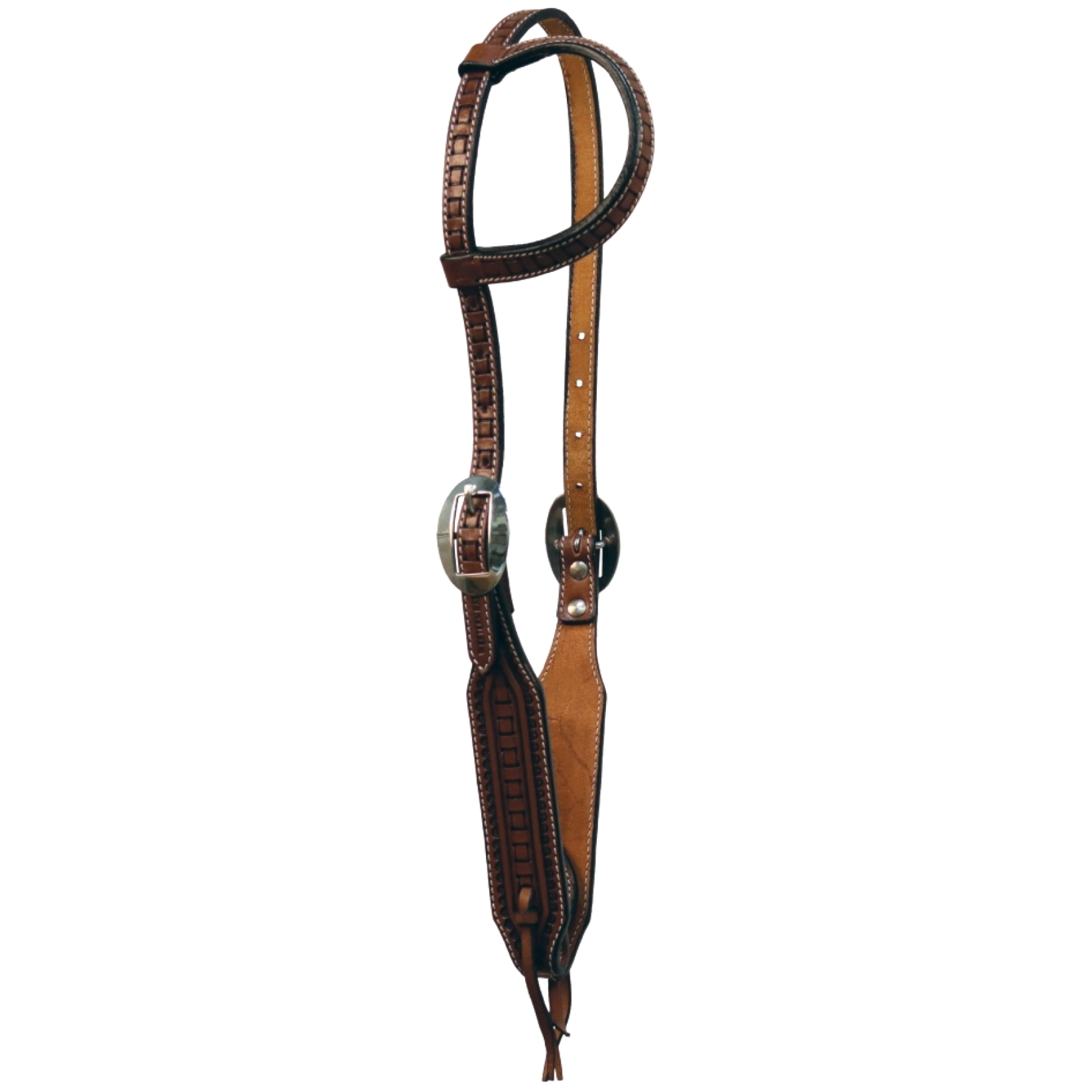 La bride Country Legend Oxbow Ribbon a un cuir travaillé et une bouclerie en acier inoxydable.