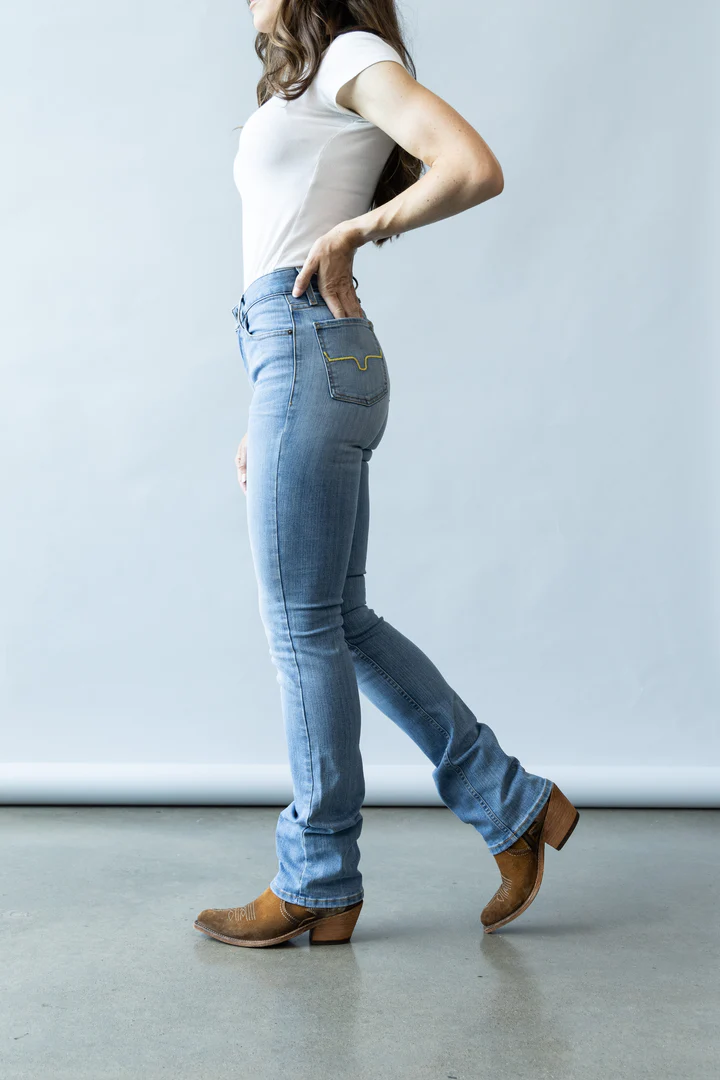 DÉTAILS: Taille Haute, Cuisse Ajustée, Boot Cut Étroite, Sablé à la Main.