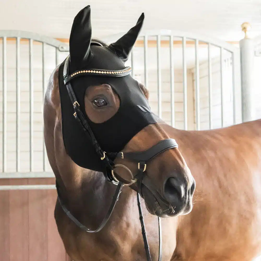 “Spirit” Soothing Hood with Ears is more than just an elegant jet-black horse mask; it’s a groundbreaking equine accessory designed to provide unparalleled comfort and reduce stress for even the most apprehensive horses. What sets this remarkable horse mask apart is its integration of Welltex technology, harnessing the benefits of infrared therapy to promote your horse’s well-being.