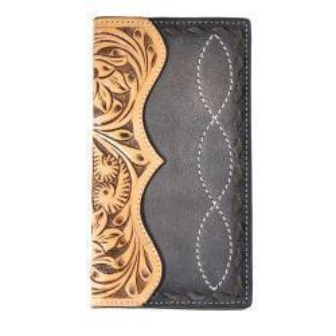 Decorative and stylish mens 3D rodeo wallet. It is made of genuine black and brown leather with a hand tooled floral design. There is black and grey roughout on the other side with chocolate buck lace around it. Multiple cash and card slots along with a checkbook slot and ID window.