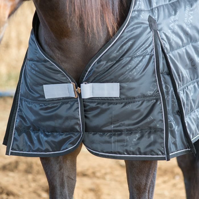 Canadian Horsewear uses a simple loop system to make it easy to add some warmth, with velcro loops at the neck area and clips at the rear corner.