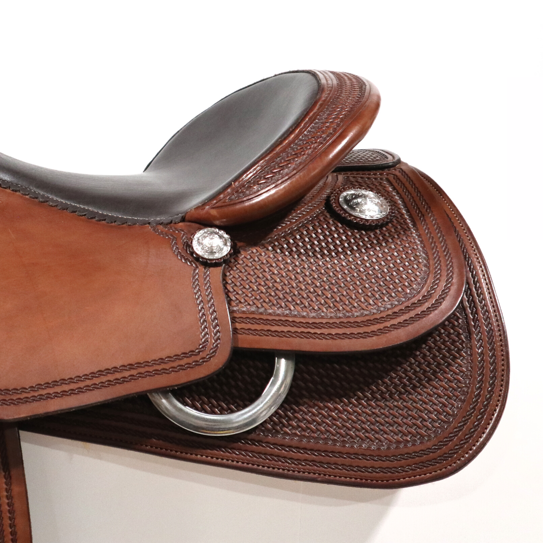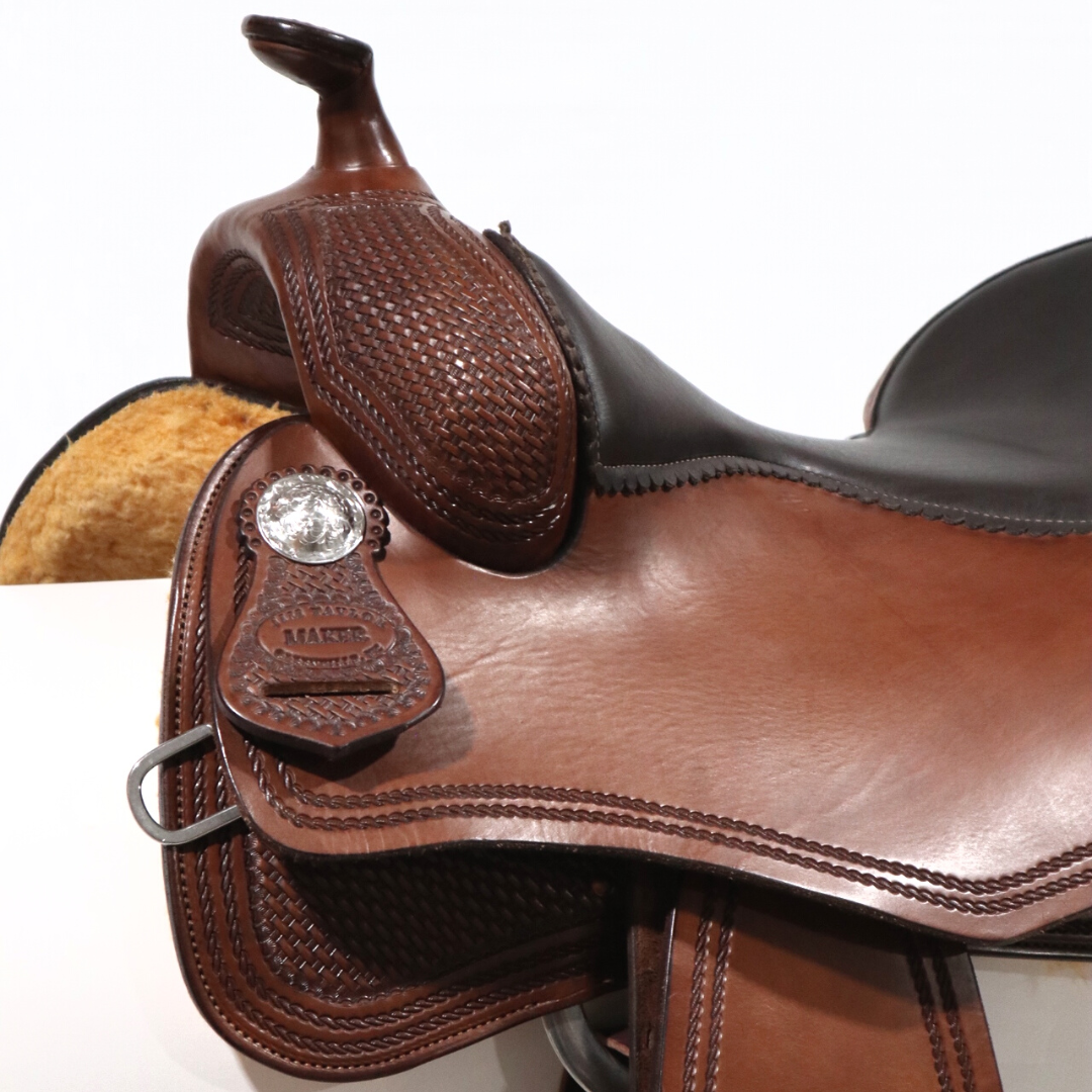 Custom Reining SaddleColor: Premium Chocolate LeatherTree: JT102 HF FG Reining HornSeat: 16.75" Chocolate Smooth LeatherShape: FG Butterfly SkirtTooling: Medium Basket With Double Rope BorderConchos: SS Hand Engraved Silver Dome ConchosRigging: Dropped-Dee Front RigsStirrups: Western Rawhide Dark Wooden StirrupsReference: JT02-20331221