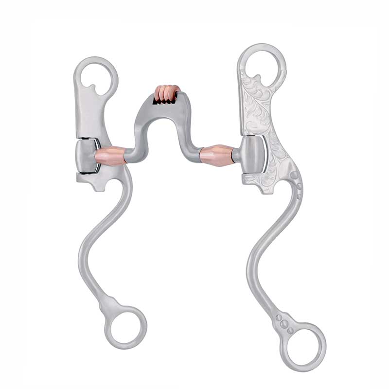 FG SS Brushed Spoon Bit with Top Rollers. Horse bit by François Gauthier Collection with a brushed stainless finish. Mouthpiece is 5-1/8" and high spoon port with copper rollers at the top of the port and copper barrels. Medium shank is 8-1/4" with stanless steel dots and engraved trim.