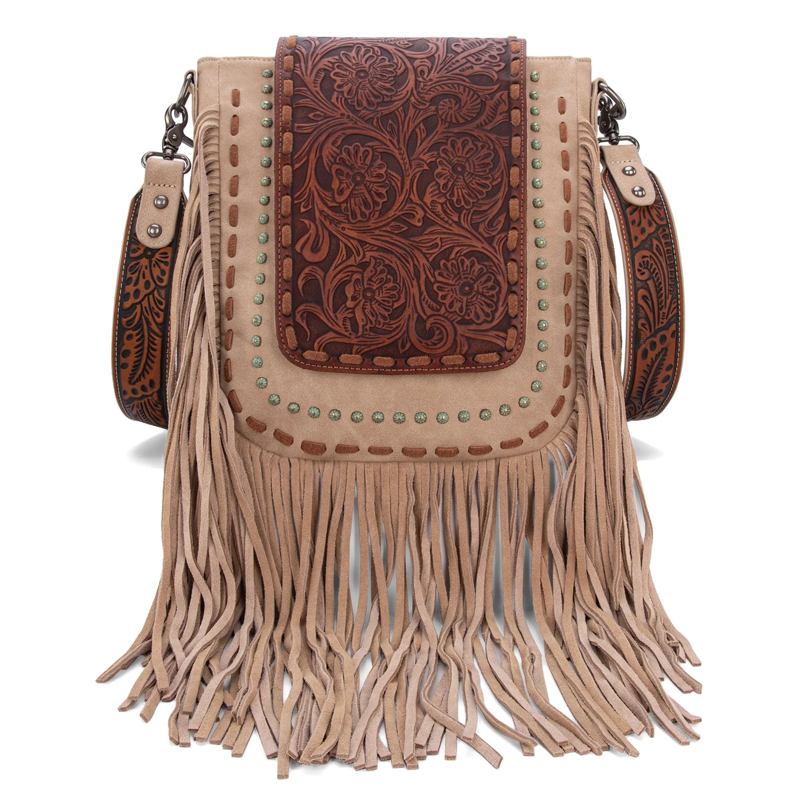 Detachable floral tooled, saddle stitch and studs detail crossbody strap (48")