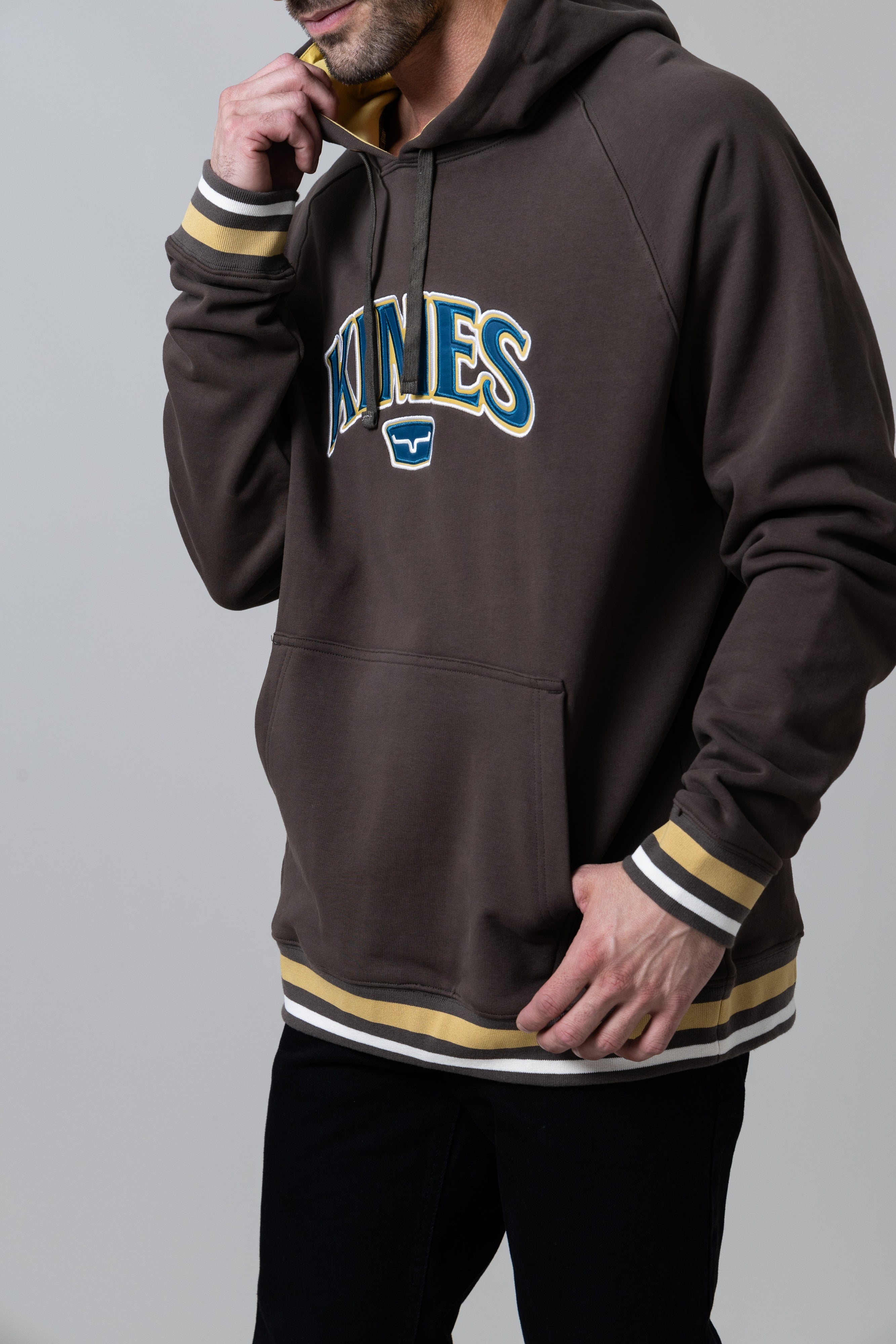 The Kubo Hood - a heavy weight French terry hoodie with a vibrant striped bottom and hand ribbing for that extra flair. This piece features “Kimes” on the chest, complemented by a horn logo underneath, adding a touch of Western charm to your casual look.