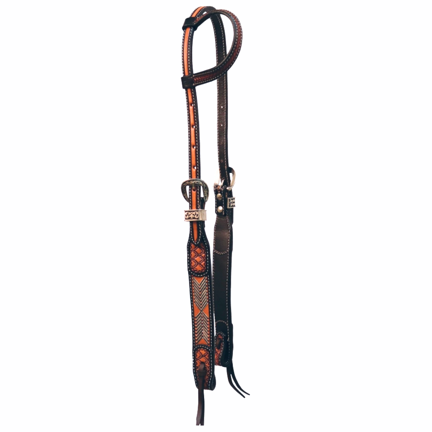 The Country Legend Navajo Bead One Ear Headstall features two-tone leather with striking Navajo bead pattern, tooling and stainless steel hardware.